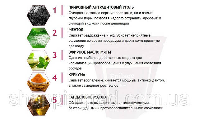 Epilage — новинка у світі депіляції та косметології, яка допоможе не тільки усунути небажаного волосся, але й сприяє ослабленню структури волосся, зволожують і живлять шкіру, насичуючи її корисними мікроелементами. Epilage випускається як спеціальний порошок, який треба розвести водою й на 10-15 хвилин залишити на шкірі. Склад цього засобу підібраний у такий спосіб, що дає змогу не тільки безболісно позбутися волосся, але й паралельно доглядає за шкірою, роблячи її гладкою та здоровою. Epilage має натуральний склад і підходить для будь-яких зон шкіри, він не викликає алергічних реакцій і не викликає подразнення після застосування. Складники Epilage глибоко проникають у дерму, розм'якшують структуру волосся, у такий спосіб спрощуючи процес його видалення.